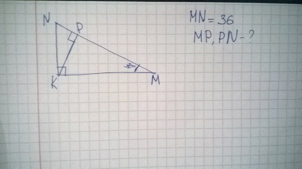 *36=18. В треугольнике NKM угол М=30 градусов, К=90 градусов, значит угол N=60 градусов. В треугольнике KPN угол Р=90 градусов,угол N=60 градусов, следовательно угол K=30 градусов. NP лежит против угла NKP=30 градусов, значит NP = половине NK =9 .