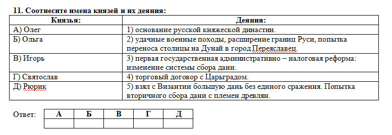 а4б3в5г2д1 Олег - торговый договор с Царьградом, Ольга - упорядочивание сбора дани, Игорь - попытка вторичного сбора дани (что и повлекло за собой его смерть и, как следствие, упорядочивание сбора дани), Святослав - попытка переноса столицы в Переяславец, Рюрик - основание русской княжеской династии