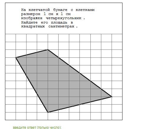 На клетчатой бумаге с размером 1х1 изображён четырёхугольник. Найдите его площадь в квадратных см.