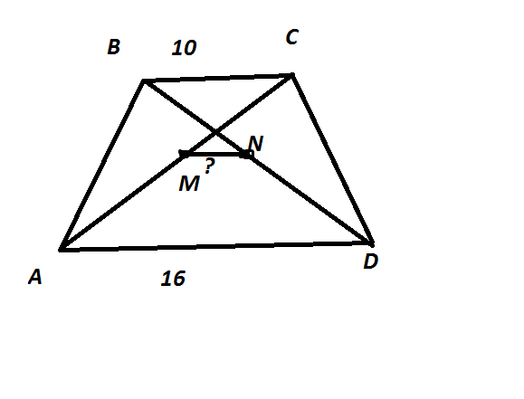 В равнобедренной трапеции АВСD точки М и N-середина диагоналей АС и ВD соответственно. Найдите длину отреpка MN, если ВС = 10 , AD = 16
