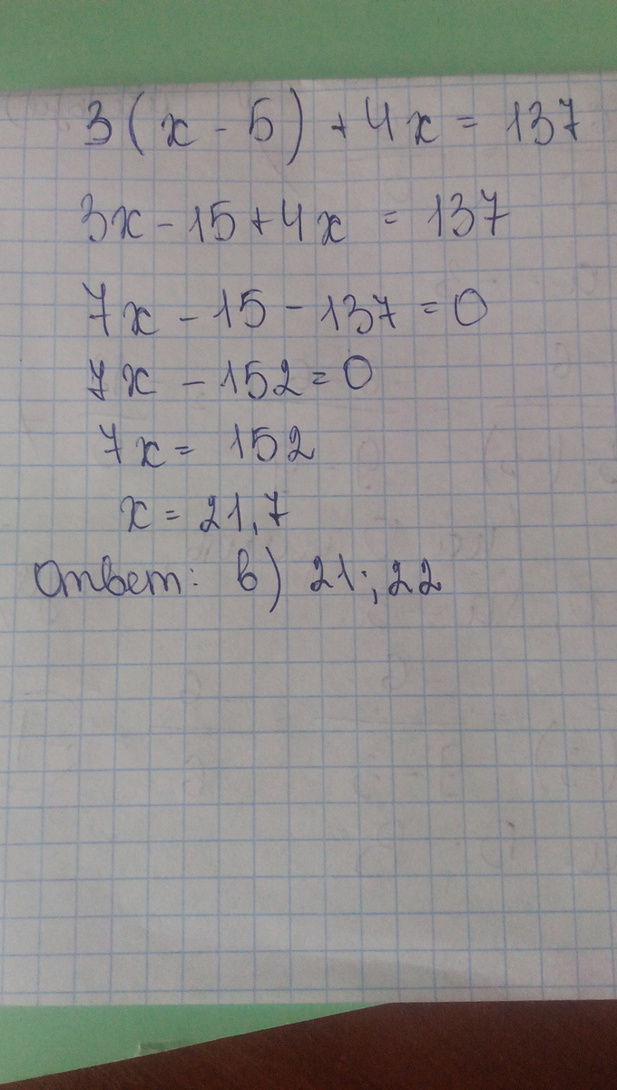 решите уравнение 3(x-5)+4x=137 найдите два соседних целых числа, между которыми расположен корень уранения