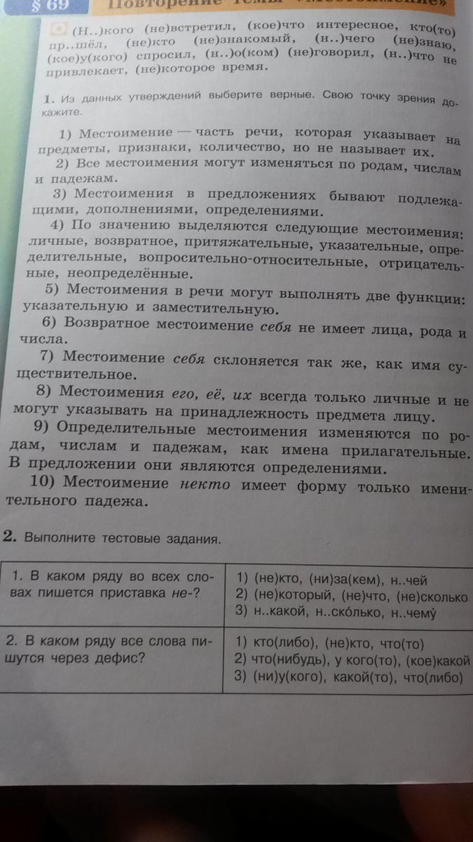 Верные утверждения 1),3),4),5),6),9),10). Неверные: 2) -например, вопросительно-относительные местоимения "кто", "что" НЕ изменяются по родам и числам, а притяжательные местоимения "его", "её", "их" не изменяются по падежам; 7) - в отличие от существительного, у этого местоимения НЕТ именительного падежа; 8) - указанные местоимения могут быть и личными , и притяжательными: увидел его (личное) - его плащ (притяжат.), любить её (личное) - её лицо (притяжат.), жду их (личное) - их взгляды (притяжат.). Во втором задании правильные ответы и в номере 1, и в номере 2 - под вторыми цифрами.