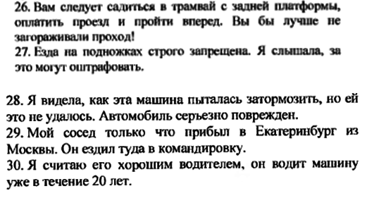 26. You should sit in the rear tram platform, pay and asked to go forward. You would be better not to obstruct the passage! 27. The food on the footrests is strictly prohibited. I've heard. it can be fined. 28. I saw this car zatormoit tried, but it failed. The car is seriously damaged. 29. My neighbor has just arrived in Yekaterinburg from Moscow. He went there on a business trip. 30. I think it is a good driver, he drives the car for the past 20 years.