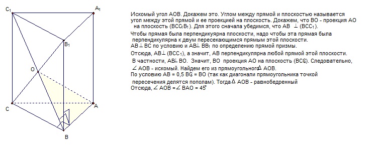 основанием прямой треугольной призмы ABCA1B1C1 является Прямоугольный треугольник ABC (угол ABC =90°) O=B1C пересекает BC1. Вычислите меру угла наклона прямой AO к плоскости грани BB1C1C, Если известно что AB = 1/2BC1