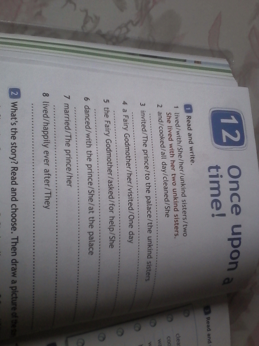 2) She cleaned and cooked all day. 3) The prince invited the unkind sisters to the palace. 4) One day a Fairy Godmother visited her. 5) She asked the Fairy Godmother for help. 6) She danced with the prince at the palace. 7) The prince married her. 8) They lived happily ever after.