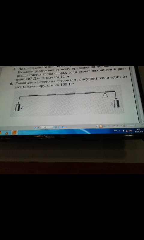 Применяем формулу: F1L1=F2L2, где F2=F1+160H, а соотношение L2/L1=1/9 (см.рис.: левое плечо -9 частей, а правое плечо-1 часть). Далее находим F1: F1/F2=L2/L1. Подставляем: F1/(F1+160H)=1/9; Переворачиваем дробь: (F1+160H)/F1=9; F1+160H=9F1; 9F1-F1=160H; 8F1=160H; F1=20H. Теперь находим F2=F1+160H; F2=180H.