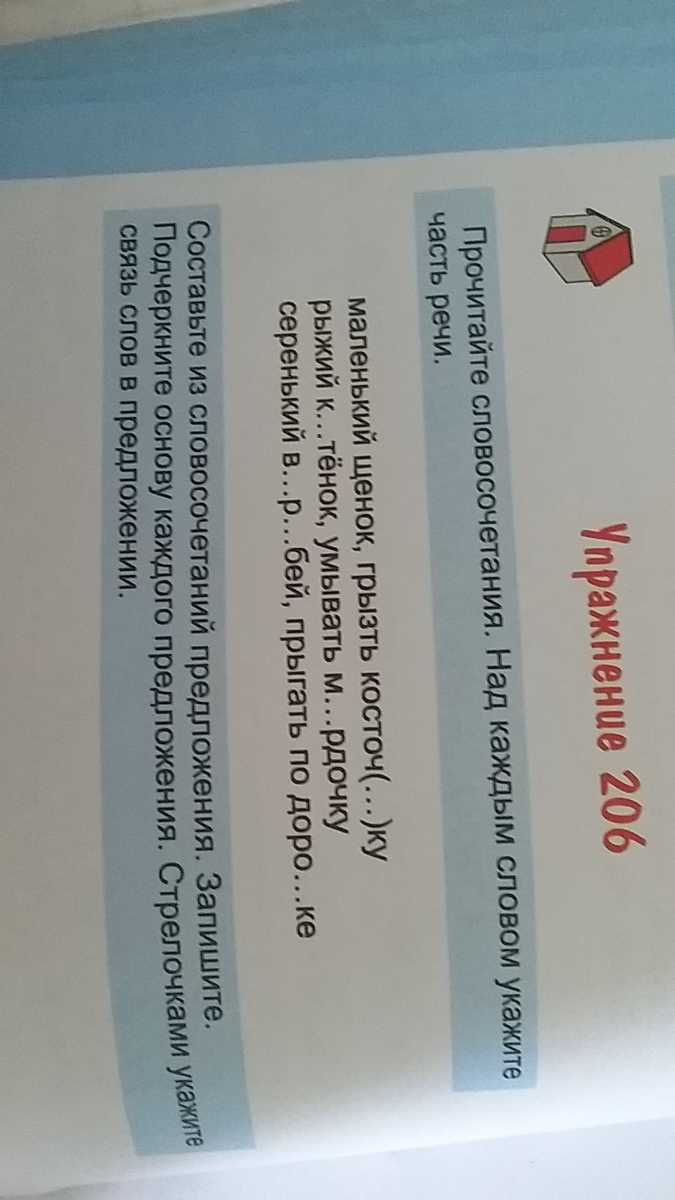 маленький щенок - маленький прилагательное, щенок существительное. грызть косточ(-)ку - грызть глагол, косточку существительное. рыжий котенок - рыжий прилагательное, котенок существительное.умывать мордочку - умывать глагол, мордочку существительное. серенький воробей - серенький прилагательное, воробей существительное. прыгать по дорожке - прыгать глагол, по предлог, дорожке существительное.