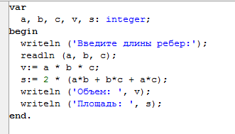 написать программу решения следующей задачи: Даны длины ребер a, b, c прямоугольного параллелепипеда. Найти его объем V = a·b·c и площадь поверхности S = 2·(a·b + b·c + a·c)