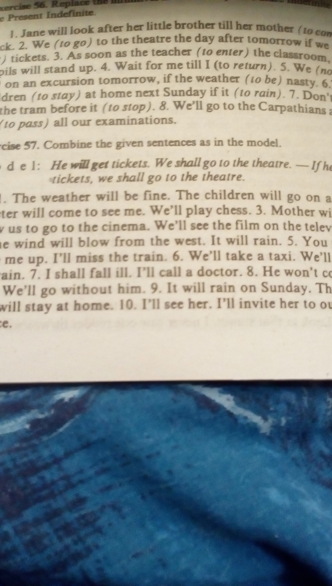 We'll see the film on the television. 4. The wind will blow from the west. It will rain. 5. You won't wake me up. I'll miss the train. 6, we'll take a taxi. We'll catch the train. 7. shall fall ill. call a doctor. 8. He won't come Time. We'll go without him. 9. It will rain on Sunday, The children will stay at home. 10. I'll see her. I'll invite her to our conference. ЗАРАНИЯ СПАСИБО.