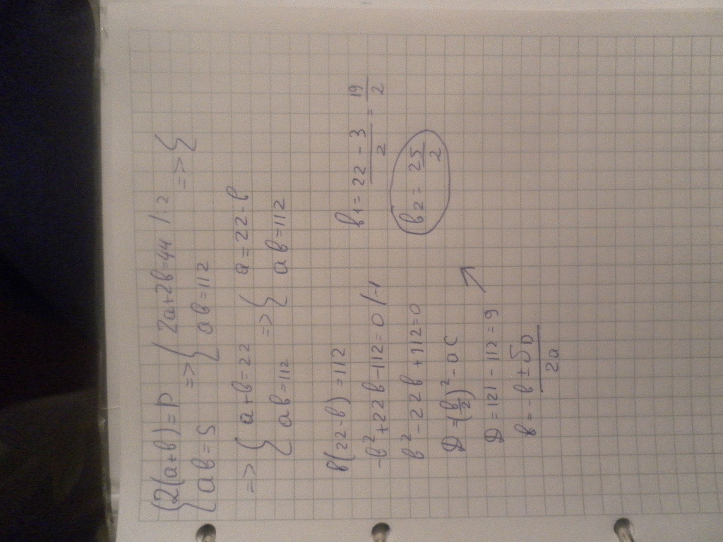 1. периметр 2*(а + в) =44, площадь а*в = 112