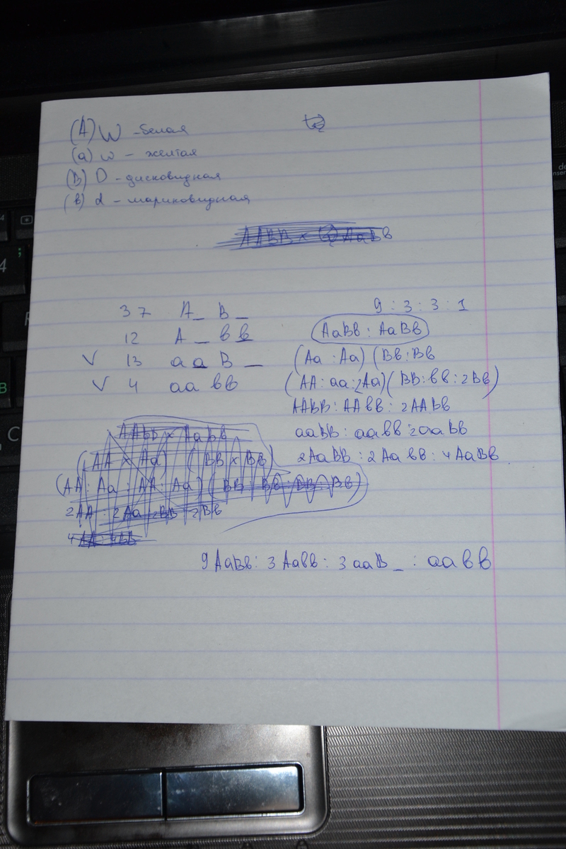 у фигурной тыквы белая окраска плодов (W) доминирует над жёлтой (w), а дисковидная форма плодов (D) - над шариковидной (d). Растение тыквы с белыми дисковидными плодами, скрещенное с растением, имеющим такие же плоды, дало потомство 37 растений с белыми дисковидными плодами, 12 - с белыми шаронидными, 13 - с жёлтыми дисковидными и 4 - с жёлтыми шаровидными. определите генотипы родительских растений.