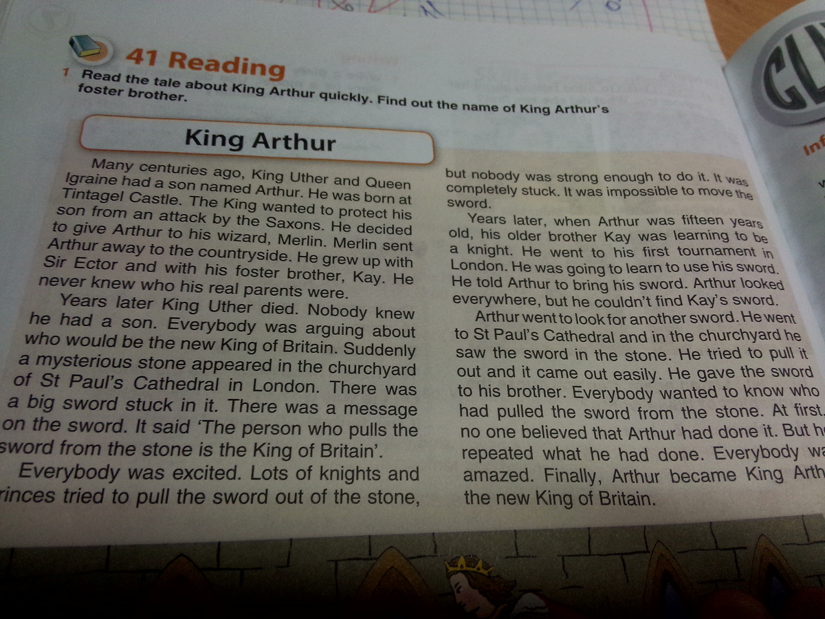 Много веков назад король Утер и королева Игрейна имени сына по имени Артур. Он родился в замке Тинтагель. Король хотел защитить своего сына jот нападения Саксов. Он решил передать Артура своему чародею( мастеру), Мерлину. Мерлин отправил Артура подальше о города. Он растил его вместе с сиром Эктором и сводным братом, Кеем. Мальчик никогда не знал кто его настоящие родители.