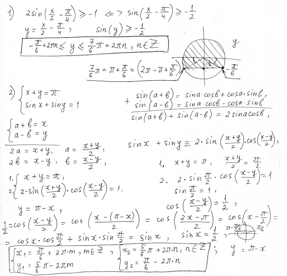 1)2sin(х/2-П/4) больше или равно -1 ответ с тригонометрическим кругом,пожалуйста