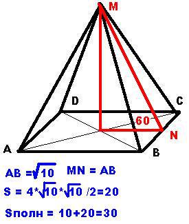 Двугранные углы при основании правильной четырёхугольной пирамиды с боковыми гранями равны 60 градусов. Площадь основания 10 см в квадрате. Найти площадь полной поверхности пирамиды