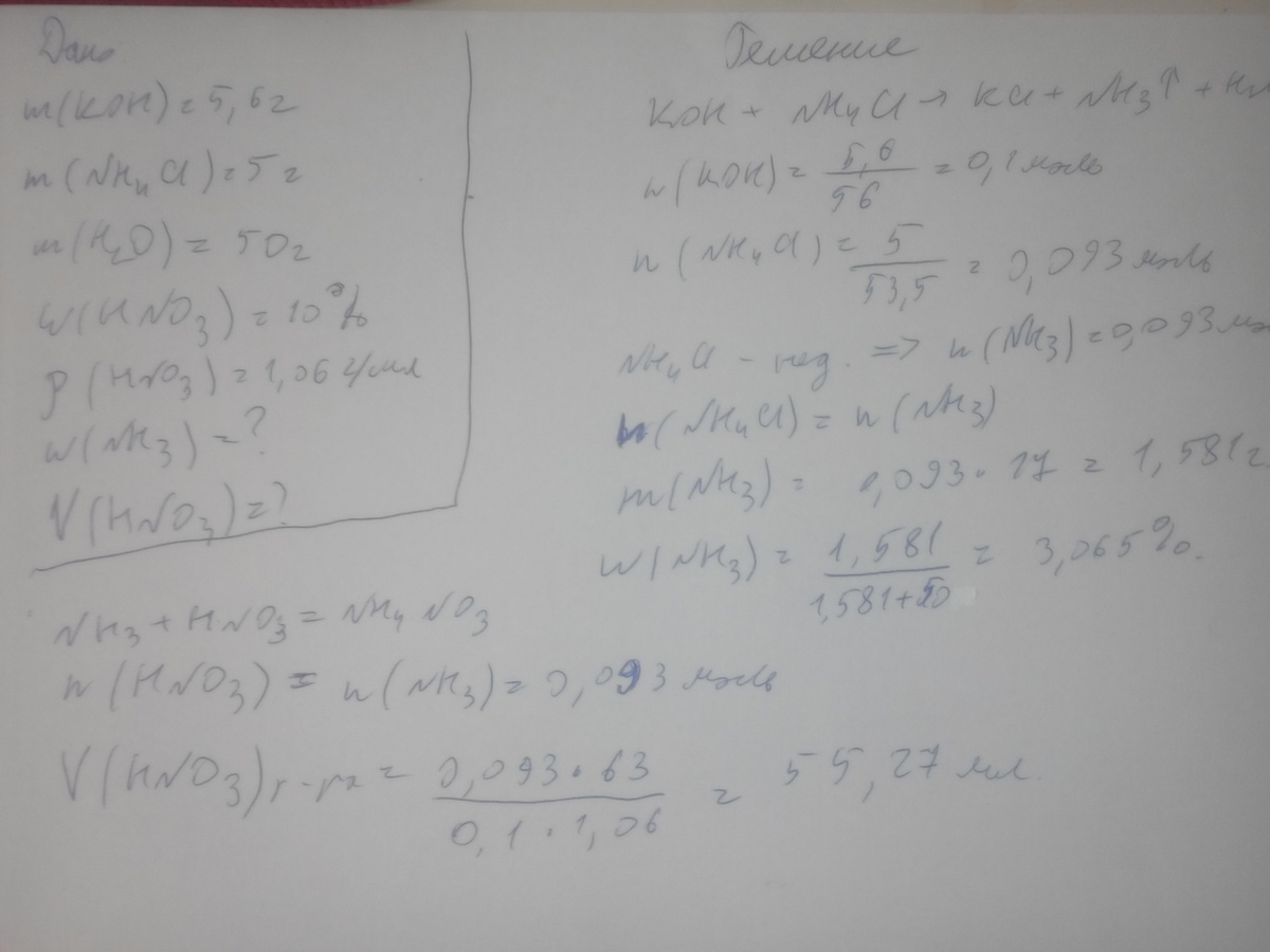При взаимодействии 5.6г. гидроксида калия с 5.0 г хлорида аммония получили аммиак.Его растворили в 50 г. воды.Определите массовую долю аммиака в полученном растворе.Определите объем 10%-ого раствора азотной кислоты с плотностью 1.06г|мл,который потребуется для нейтрализации аммиака.