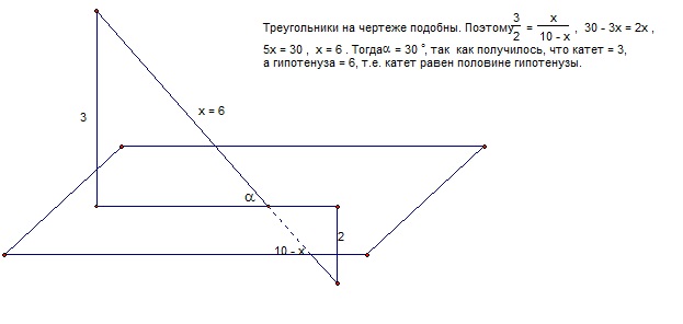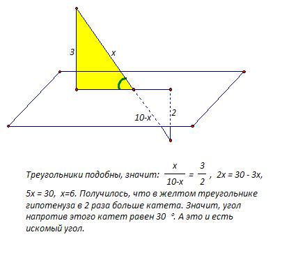 применены: определение угла между прямой и плоскостью; признак подобия треугольников по двум углам (пара вертикальных углов, пара прямых углов); пропорциональность сходственных сторон; свойство катета против угла в 30 градусов