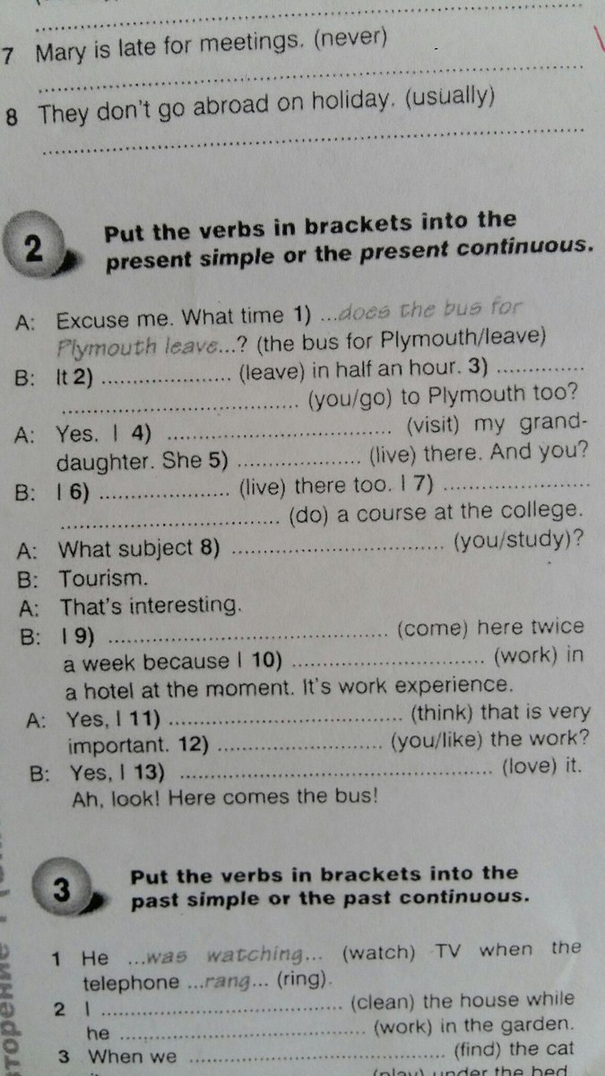 2. leaves 3. are you going 4. I am visiting 5. lives 6. live 7. do 8. what subject are you studying? 9. come 10. i'm working 11. think 12. do you like 13. I love