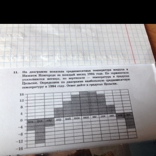 Посомтрев на диаграмму мы видим, что в июле температура наивсшая. Ответ: Июль, 16 градусов