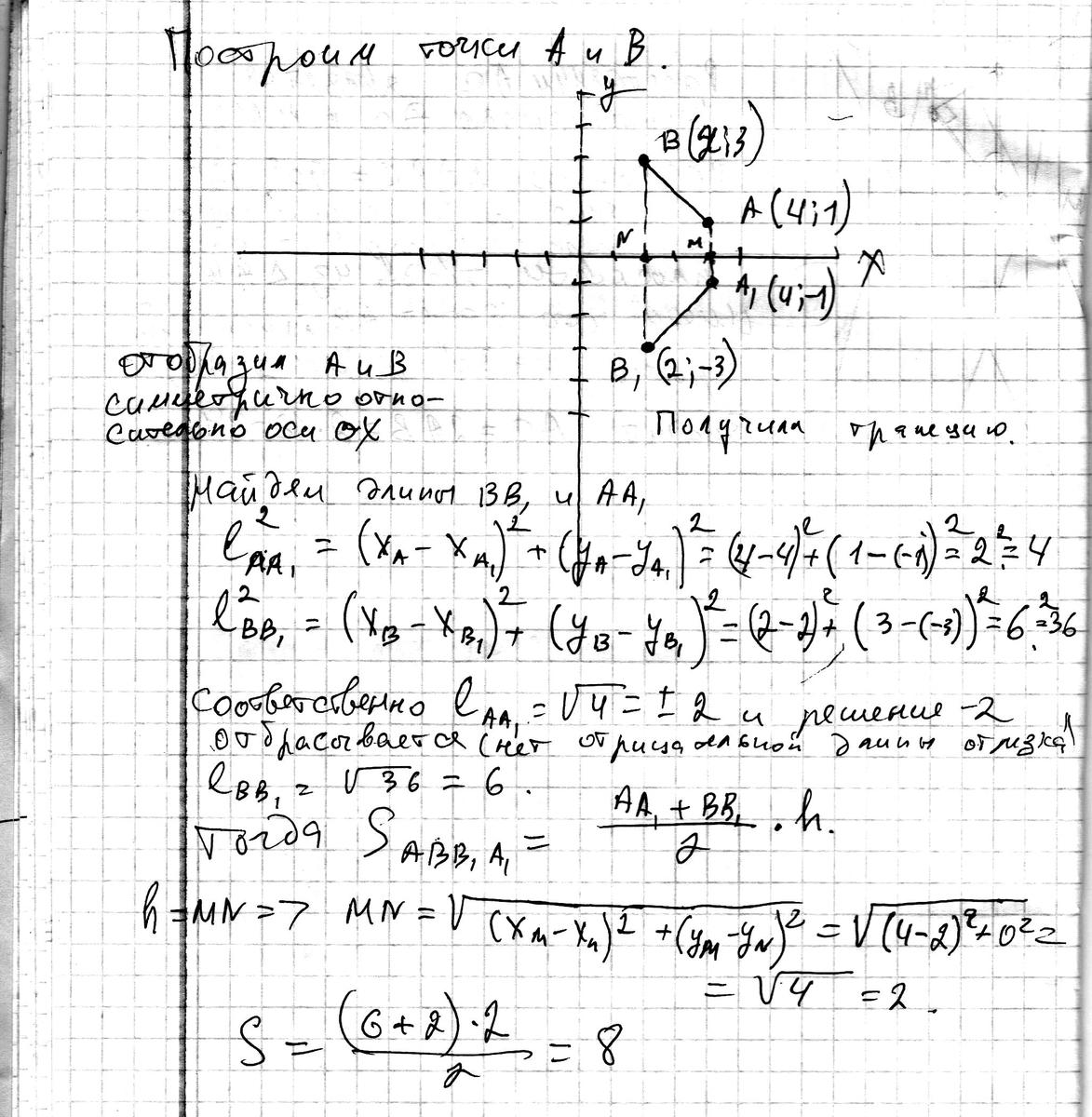 Даны точки А(4;1), В(2;3). Точки А1 и В1 симметричны им относительно оси ОХ. Найдите площадь трапеции АВВ1А1