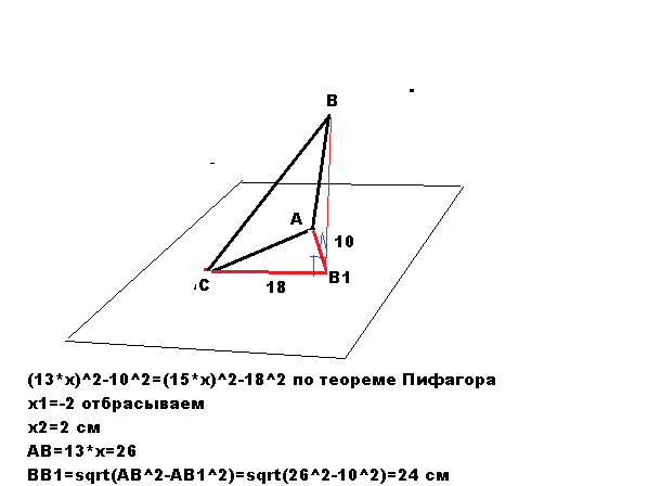 Через сторону AC треугольника ABC проведена плоскость альфа, не совпадающая с плоскостью треугольника.Найдите расстояние от точки B до плоскости альфа, если AB:BC=13:15, а их проекции на плоскость альфа равны 10 и 18 см .