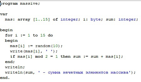 Сумма всех нечетных элементов в одномерном массиве, размером в 15 ячеек.