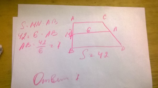 средняя линия прямоугольной трапеции равна 6 см. Найдите меньшую боковую сторону трапеции если ее площадь равна 42 см
