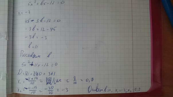 Один из корней уравнения 5х^2+вх-12=0 равен -3. НАЙДИТЕ КОЭФФИЦИЕНТ в и другой корень уравнения.