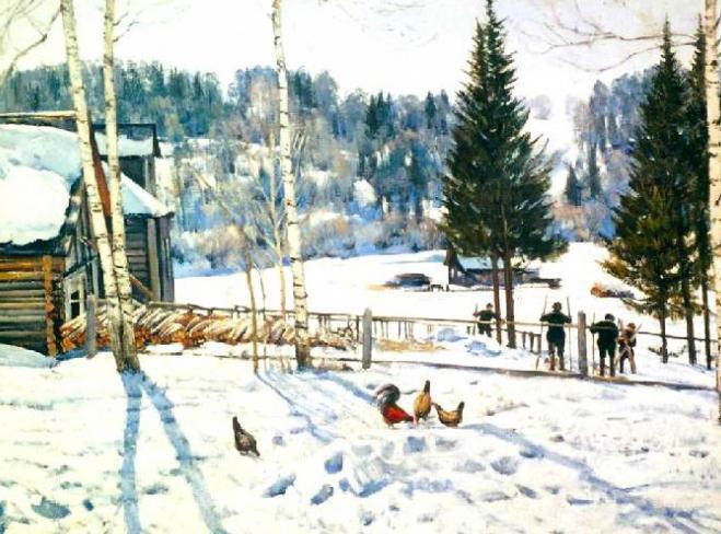 На картине К. Юона "Конец зимы.Полдень" изображено удивительное время - конец весны. На улицах еще лежит снег, но дни становятся погожими, безветренными. Действие картины происходит где-то в деревне. На переднем плане мы видим дом. Он сделан из дерева. Перед домом по снегу бегают куры. За забором мы видим лыжников. Они наслаждаются последними зимними деньками.