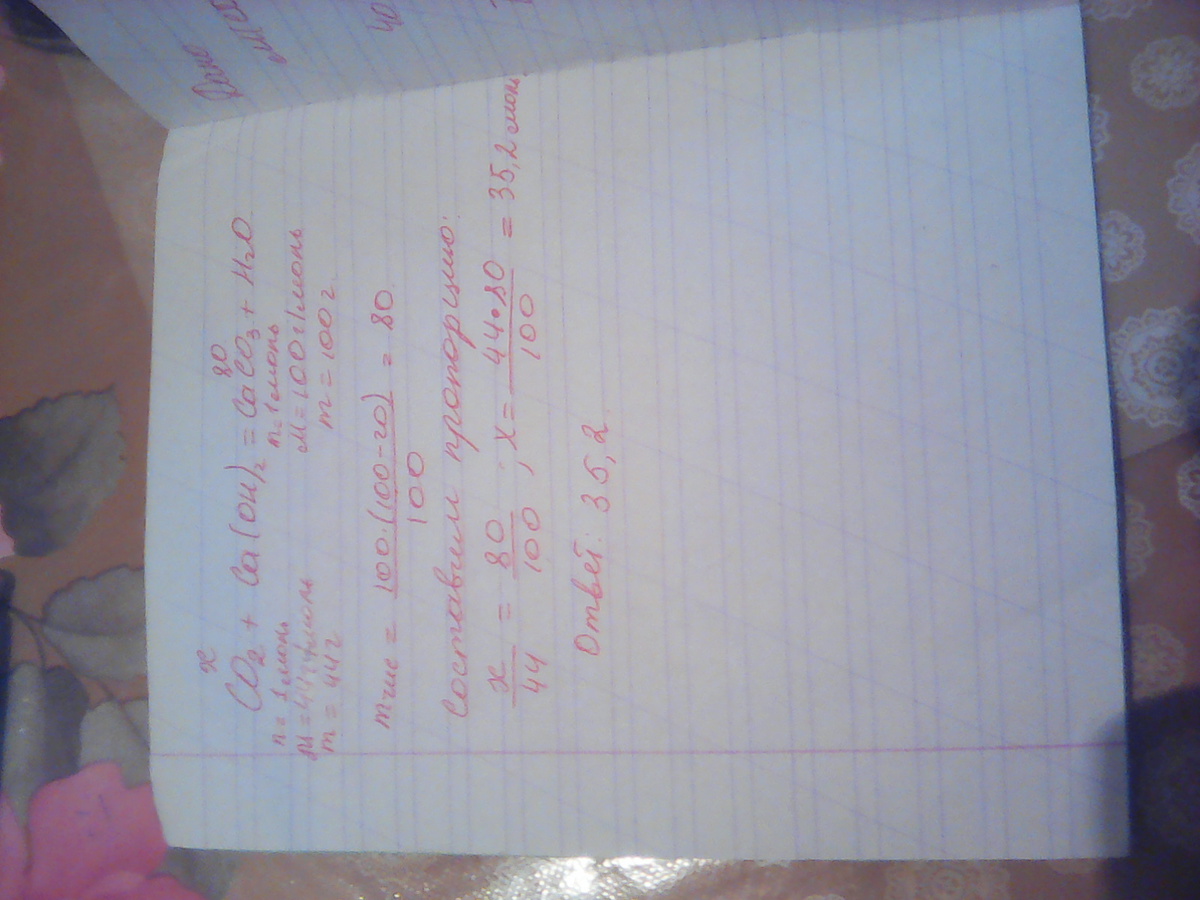 CO2+Ca(CO)2=CaCO3+H2O - уравнение реакции. карбонат кальция содержит 20% примесей. Нам надо найти масса чистого вещества- карбоната кальция. Масса чистого СаСО3=100*(100-20)/100=80. Затем нам надо найти молярную массу СаСО3. это равно М( СаСО3)=40+12+16*3=100г/моль. значит m=100г. точно так же найдём молярная масса СО2. это равно М(СО2)=12+16=44г/моль Значит m(CO2)=44г. Составим пропорцию: х/44=80/100; х=44*80/100=35,2. Ответ:35,2