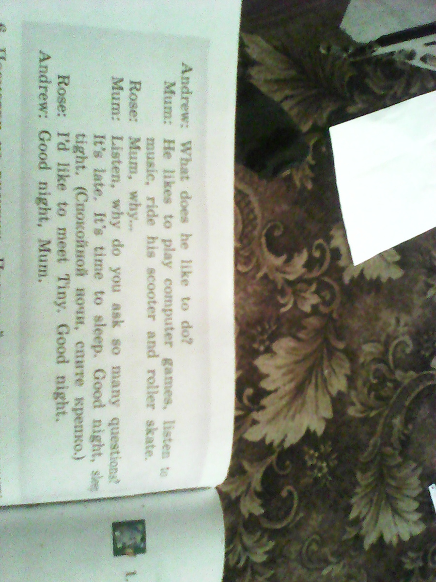 Andrew: Что он любит делать? Мама: Он любит играть в компьютерные игры, слушать музыку, ездить на скуторе и роликовых конькахи. Роза: Мама, почему ... Мама: Слушай, а почему вы спрашиваете так много вопросов? Это поздно,всё спать. Спокойной ночи Роза: Я бы хотел встретиться с малолетка, Спокойной ночи. Andrew: Спокойной ночи, мама.