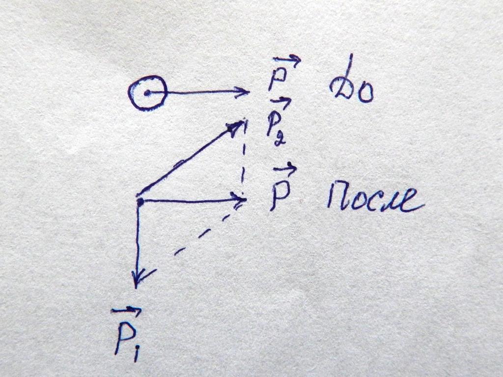Другими словами импульс снаряда должен равняться сумме импульсов осколков (смотри рисунок)