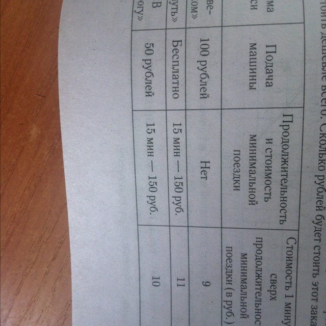 В таблице даны тарифы на услуги трех фирм такси. Предполагается поездка длительностью 40 минут. Нужно выбрать фирму, в которой заказ будет стоить дешевле всего. Сколько будет стоить этот заказ?