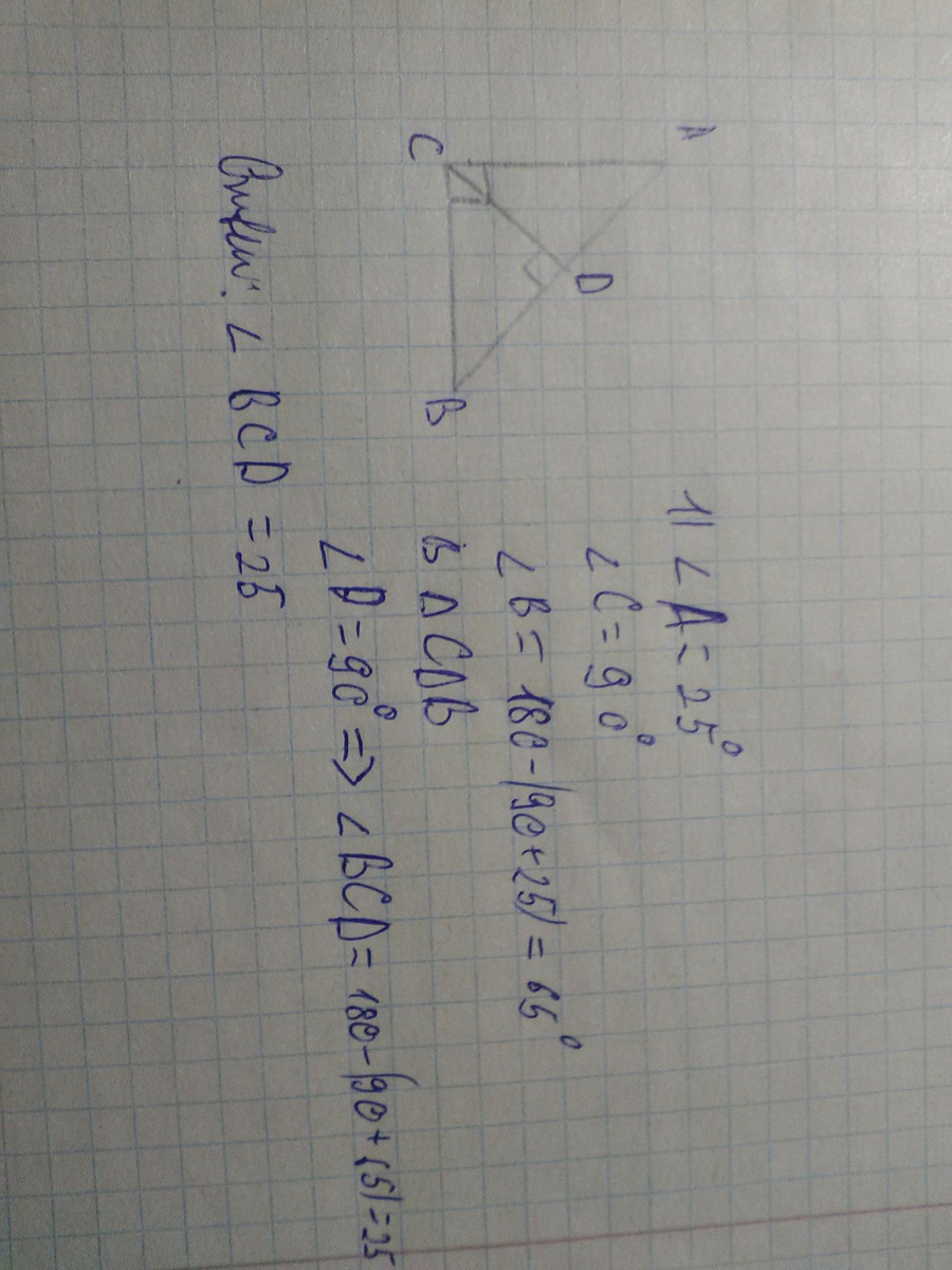 Из вершины прямого угла прямоугольного треугольника АВС проведена высота СD.Найдите угол ВСD.если 1)угол А=25;2)уголА=70градусов