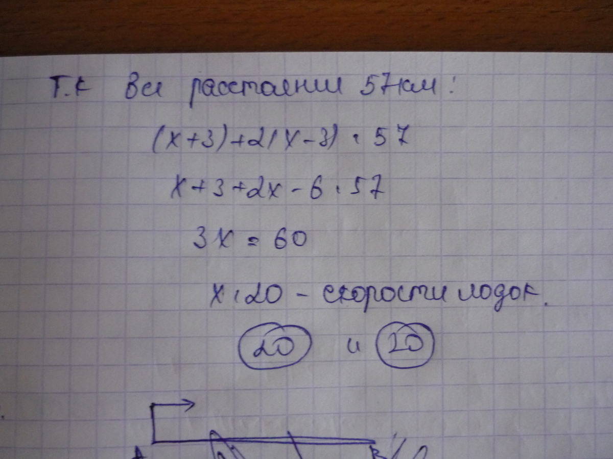 2. Из двух пунктов реки, расстояние между которыми равно 57км, навстречу друг другу движутся две моторные лодки, собственные скорости которых равны. Лодка, идущая по течению, до встречи шла 1час, а лодка, идущая против течения 2 часа. Скорость течения реки 3 км/ч. Найти собственную скорость каждой лодки.