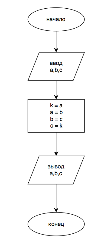 Даю 34 балла))) Составить блок-схему. Даны значения трех действительных переменных a, b и c. Обменять местами их значения так, чтобы a получила бы значение b, b получила значение c, а переменная c получила значение a.
