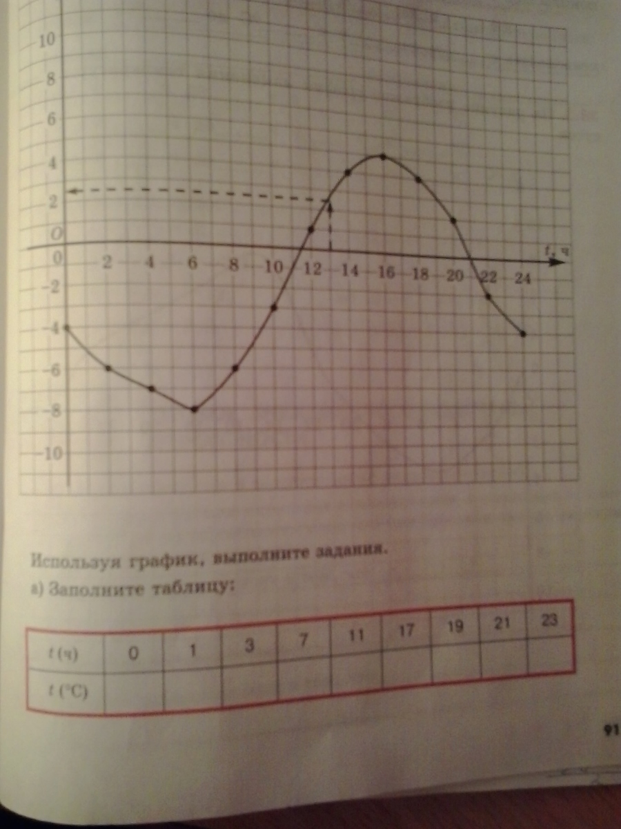 2 На следующем рисунке отмеченные точки соединины плавной линией. Полученная линия - это тоже график температуры.По этому графику можно приблизительно определить температуру для любого времени суток.например ,на рисунке показано, как определить температуру в 13 часов : +2,5 градусов Цельсия.