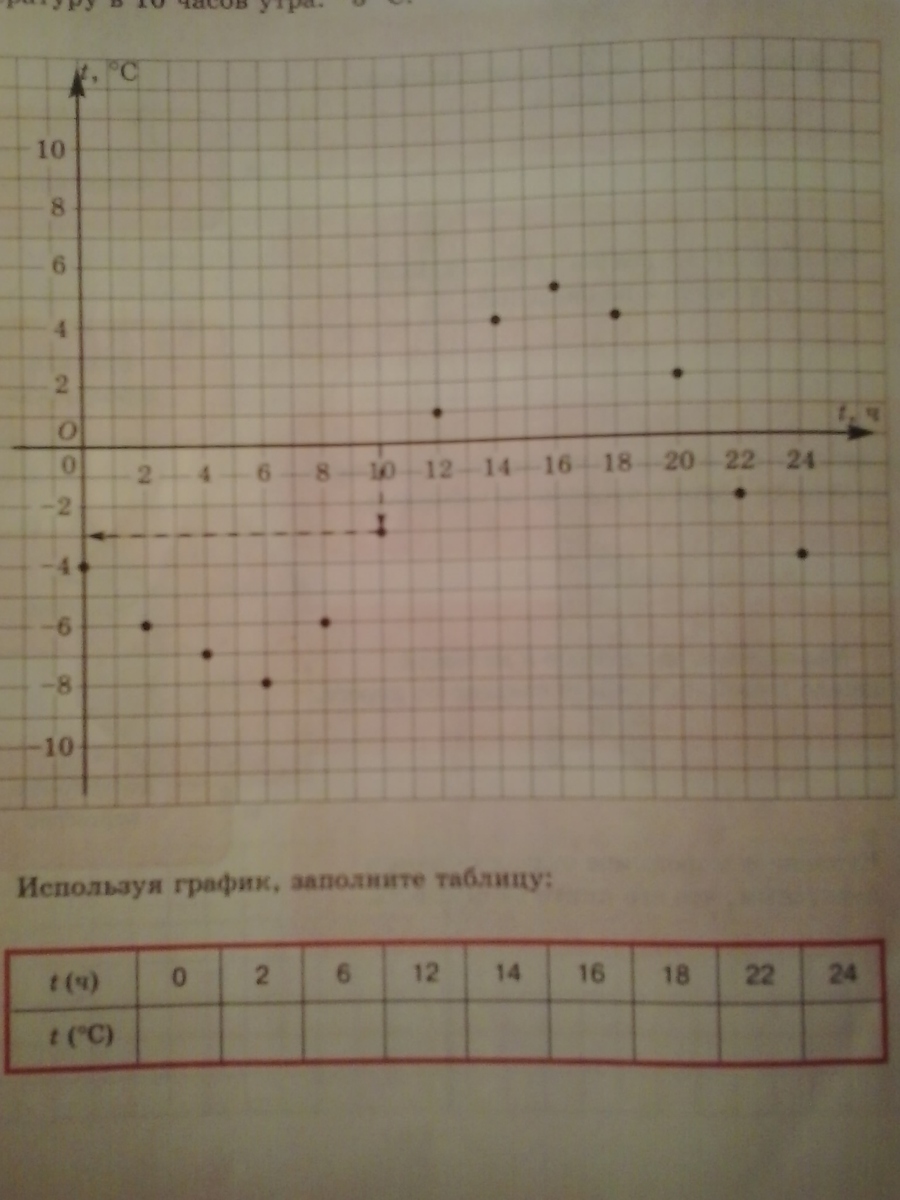 1 .В изображенной системе координат горизонтальная ось Ot означает время суток (в часах) ,вертикальная ось Ot - температуру воздуха (в градусах Цельсия).Точки ,отмеченные в этой системе координат , - это график изменения температуры воздуха в течение суток.По этому графику можно определить температуру воздуха в то или иное время,выраженное четным числом часов.Например,на рисунке показано, как определить температуру в 10 часов утра : -3 градуса Цельсия.