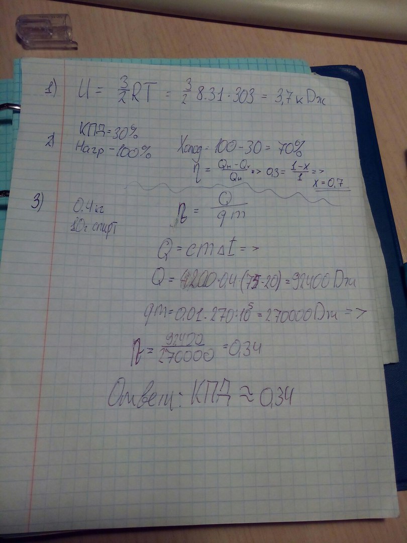 3. На спиртовке нагрели 400 г воды от 20С до 75С. Каков КПД нагревательной установки, если при этом было сожжено 10 г спирта?
