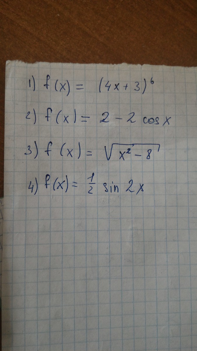 1); ; y=(4x+3)^6; ,; ; ; ; (u^{n})'=ncdot u^{n-1}cdot u'\\y'=6(4x+3)^5cdot (4x+3)'=6(4x+3)^5cdot 4=24(4x+3)^5\\2); ; y=2-2cosx\\y'=2'-2cdot (cosx)'=0-2cdot (-sinx)=2sinx\\3); ; y=sqrt{x^2-8}; ,; ; ; ; (sqrt{u})'=frac{1}{2sqrt{u}}cdot u'\\y'=frac{1}{2sqrt{x^2-8}}cdot (x^2-8)'=frac{2x}{2sqrt{x^2-8}}=frac{x}{sqrt{x^2-8}}