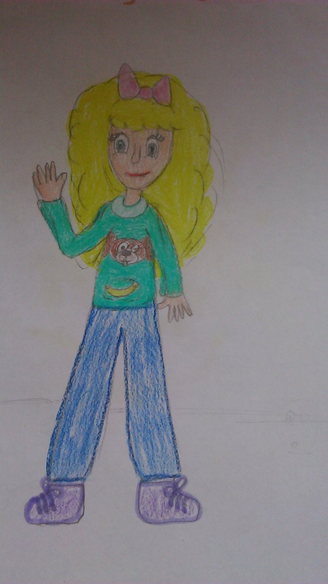 My Alice is dressed in a green sweater which painted a monkey with a banana, blue jeans and purple shoes.