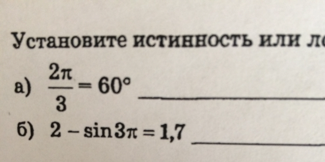 а) 2pi/3 = 2*180/3 = 2*60 = 120 =/= 60 - ложное