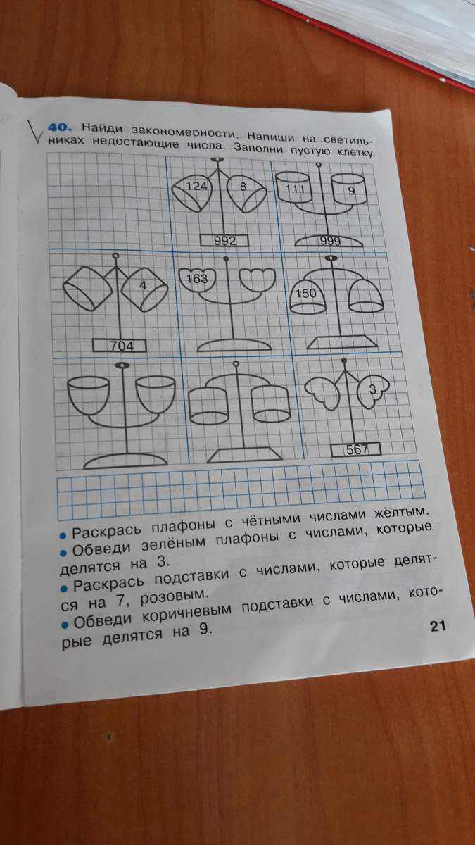 Цифра 7 на правом плафоне в первой клетке, тк счёт начинается с правой верхней клетки и с цифры 9,(8,7,6,5,4,3,2,1- написано на правых плафонах, если считать справа налево). Все остальные действия написаны в клетках или под ними (на фото ).