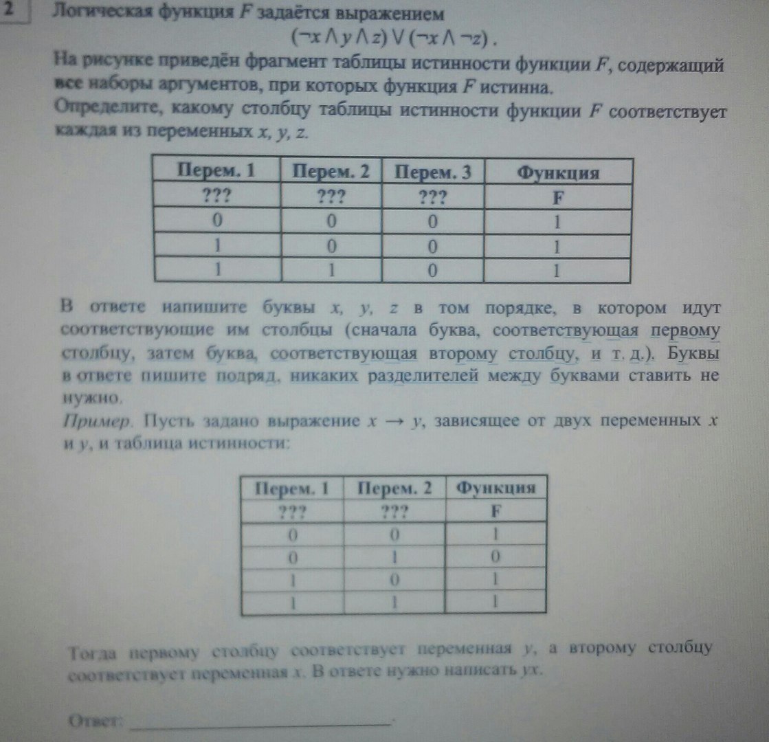 Комбинацию значений 0, 1, 1 видим в последней строке таблицы, значит Перем.3 - это x; из второй строки определяем, что Перем. 2 - это z, следовательно, Перем.1 - это y.