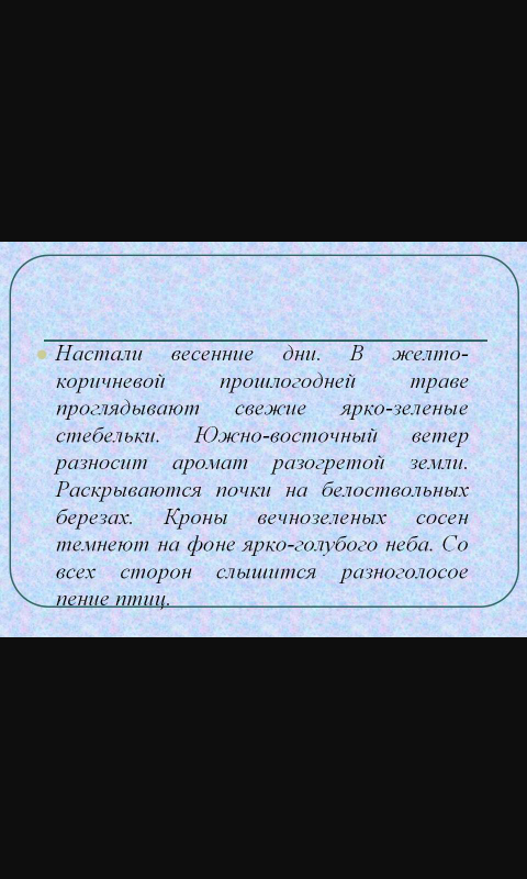 После холодной зимы, наконец, приходит долгожданное потепление. В ясный весенний день совсем не хочется сидеть в помещении. Хочется выйти на улицу и просто гулять, дышать свежим воздухам, греться под ласковым солнышком, слушать пение птиц, наблюдать пробуждение природы. Весенний день наполняет воздух ароматами мокрой земли, молодой зелени, первых цветов.