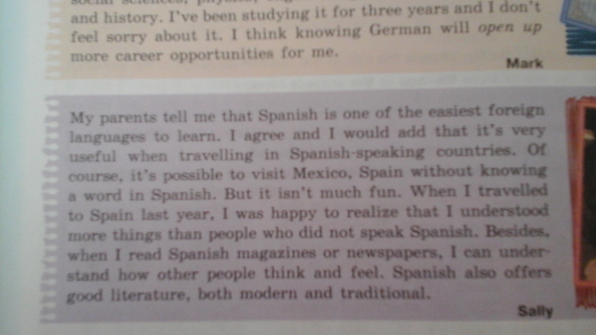 Мои родители сказали мне что испанский язык один из саміх легких иностранных языков для изучения. Я согласен я бы добавил что это очень полезно когда путешествуешь по испано-говорящим странам. Конечно, можно поехать в Мексику, Испанию без знания и слова по испански. Но это не очень хорошо (весело). Когда я ездил в Испанию в прошлом году, я был очень счастлив использовать то что я понимаю больше чем люди которые не говорят по испански. Кроме того, когда я читаю испанские журналы или газеты, я могу понять что думают или чувствуют другие люди. Испания так-же предлагает хорошую литературу и современную и традиционную.