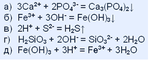 Fe³⁺ + 3OH⁻ = Fe(OH)₃↓В) K₂S + 2HCl = 2KCl + H₂S↑