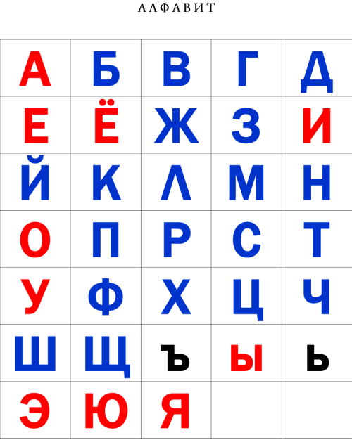Обычно: синим цветом обозначаются согласные, красным - гласные, а чёрным - знаки