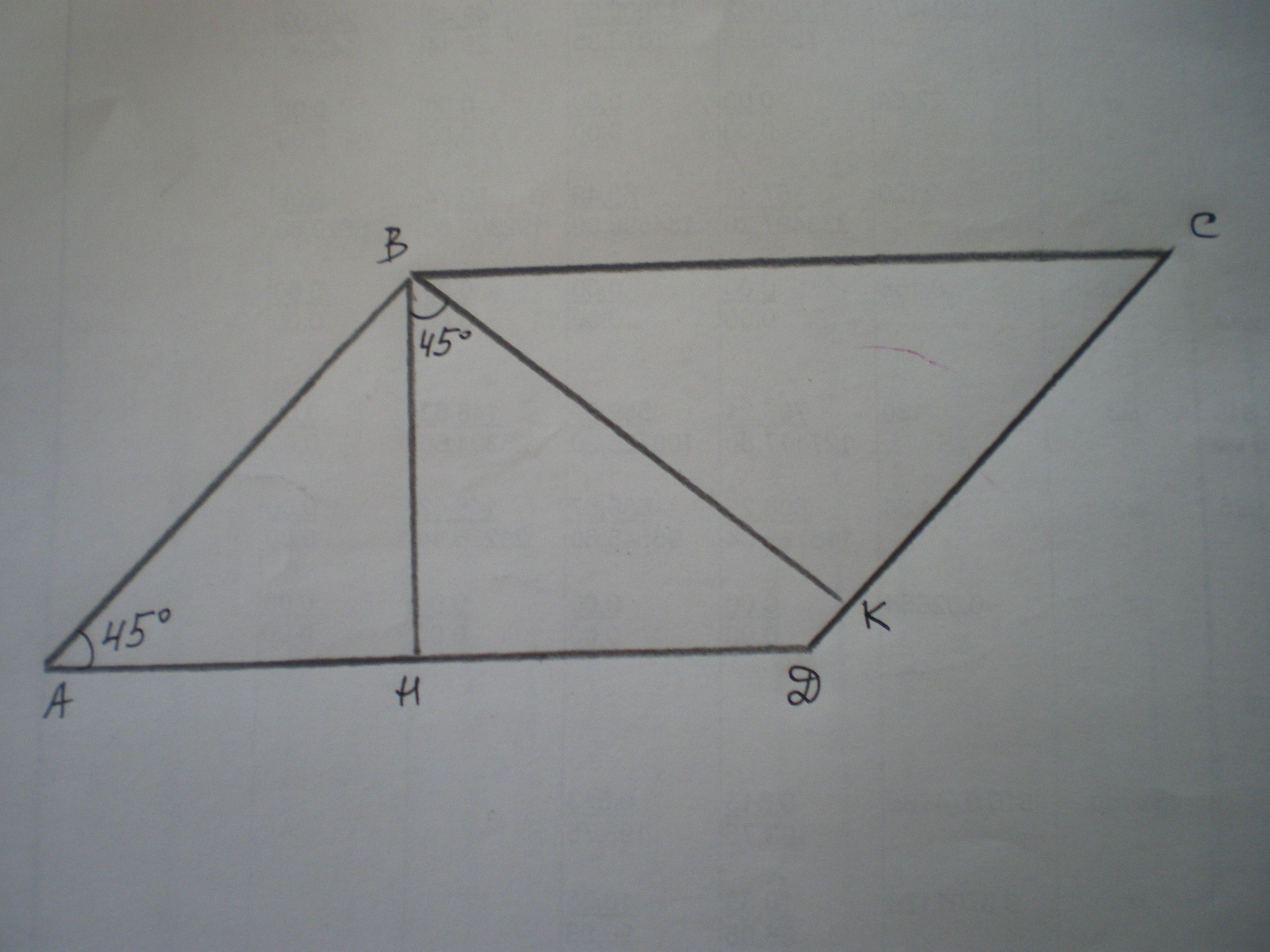 Высоты параллелограмма, опущенные из одной вершины, образуют угол, равный углу параллелограмма при соседней вершине. Значит, ∠А=∠НВК=45°