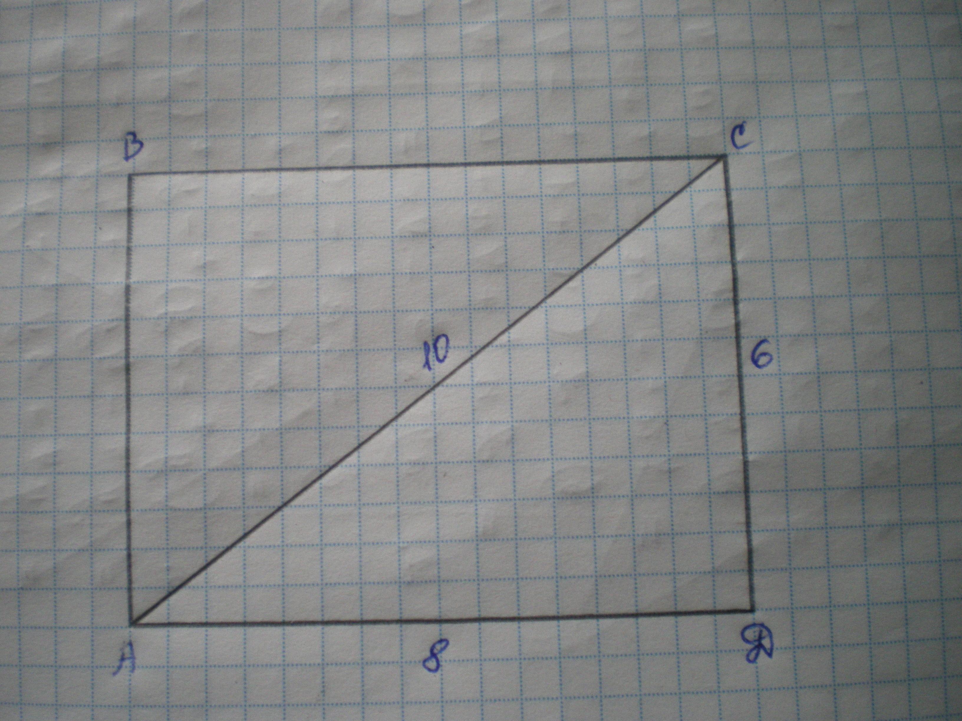 Дано: прямоугольник АВСД, АВ=СД=6 см, ВС=АД=8 см. АС - диагональ. АС=10 см.