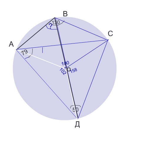 четырёхугольник ABCD вписан в окружность. Угол ABC равен 130 градусам, угол CAD равен 79 градусам. Найдите угол ABD. Ответ дайте в градусах